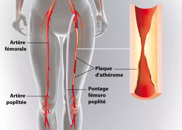 Pour l’artérite des jambes, le problème est le même : un rétrécissement empêche le sang artériel d’arriver dans la jambe. Le chirurgien va donc créer une dérivation, appelée pontage.